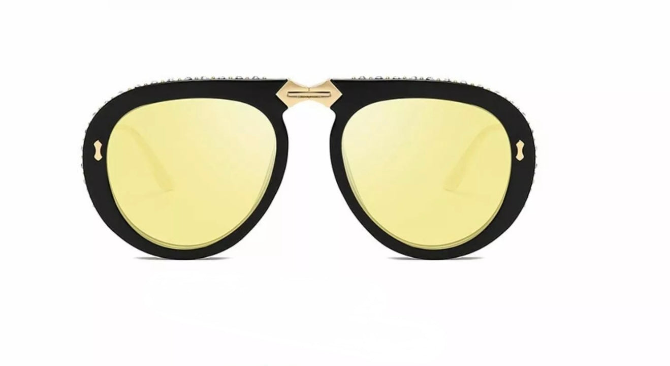 Stylish foldable aviator sunglasses featuring crystal-embellished frames for compact convenience and sparkling appeal.